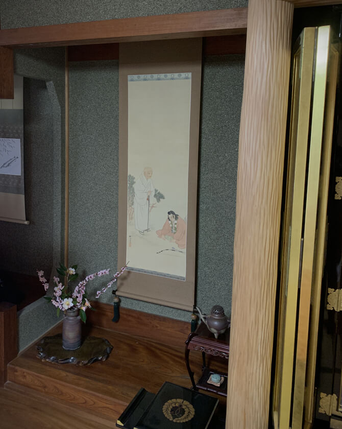 掛軸は主人が来客に対して季節や行事などに応じて最も相応しいものを飾り、おもてなしをする為の道具です。ゲストは飾られている掛軸を見て主人のおもてなしの気持ちを察して心を動かす。決して直接的な言葉や趣向ではなく、日本人らしく静かにさりげなく相手に対しておもてなしのメッセージをおくり、心をかよわせる日本の伝統文化です。