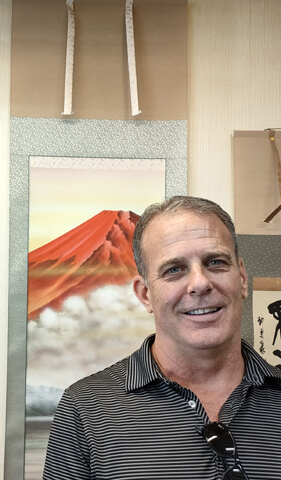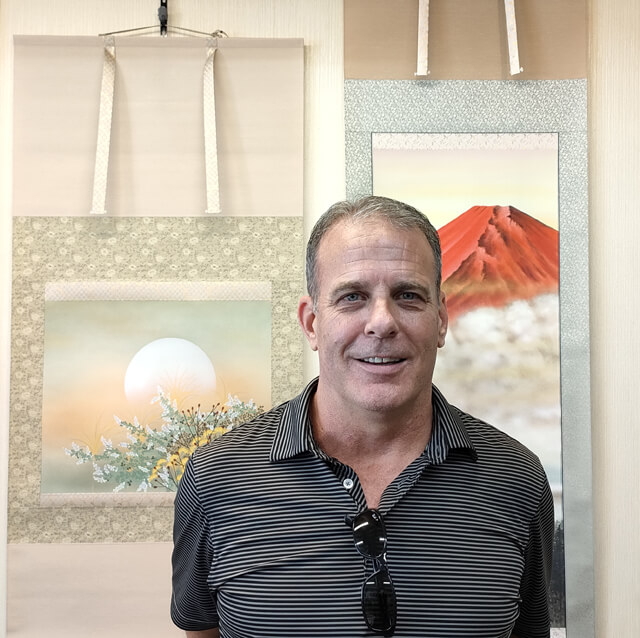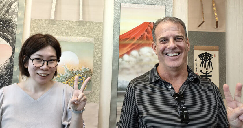 店内をじっくりご覧いただく中で、ニックさんの目を引いたのが「赤富士」の掛軸。朝日に染まる富士山の力強く荘厳な姿はニックさんご自身のパワフルで前向きなオーラにぴったりと重なったようで、すぐに「これは自分にふさわしい」とご購入を決断されました。まさに、作品と持ち主が引き合うような不思議な出会いでした。