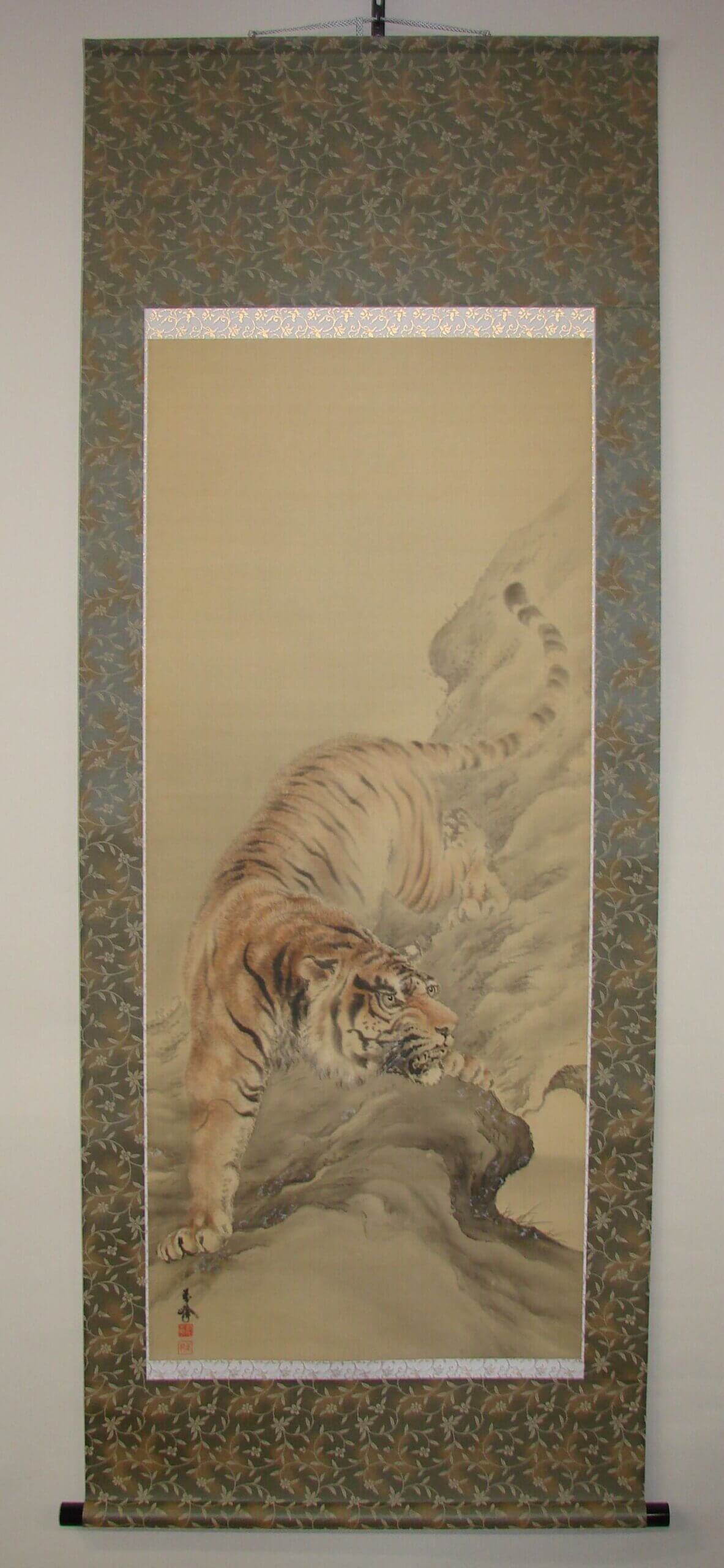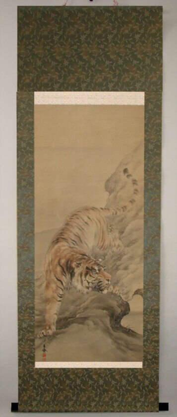 今回、ご相談いただいた掛軸がこちらです。力強く岩場でポーズをとる虎が描かれた作品です。