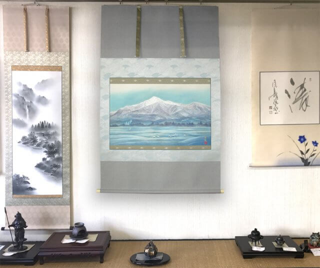 掛軸は主人が来客に対して季節や行事などに応じて最も相応しいものを飾り、おもてなしをする為の道具です。ゲストは飾られている掛軸を見て主人のおもてなしの気持ちを察して心を動かす。決して直接的な言葉や趣向ではなく、日本人らしく静かにさりげなく相手に対しておもてなしのメッセージをおくり、心をかよわせる日本の伝統文化です。