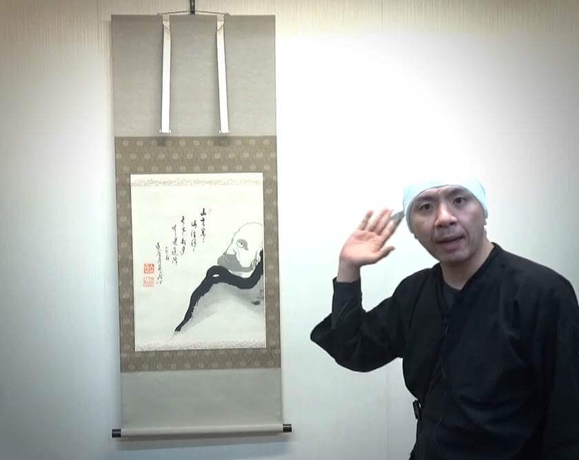 掛軸は主人が来客に対して季節や行事などに応じて最も相応しいものを飾り、おもてなしをする為の道具です。ゲストは飾られている掛軸を見て主人のおもてなしの気持ちを察して心を動かす。決して直接的な言葉や趣向ではなく、日本人らしく静かにさりげなく相手に対しておもてなしのメッセージをおくり、心をかよわせる日本の伝統文化です。