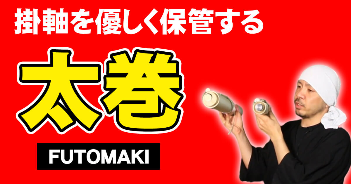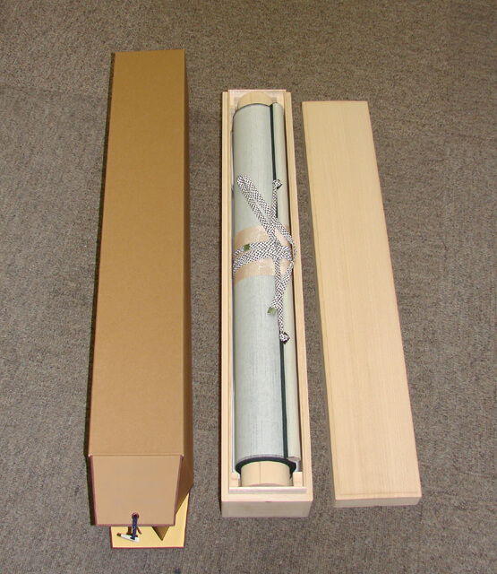 今回は下の写真のように太巻仕様の桐箱で保管しております。このように掛軸の直径を大きく巻いて保管する事で作品への負荷を軽減する事が可能なのです。