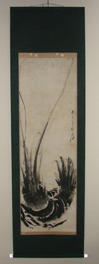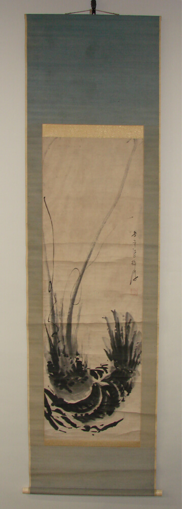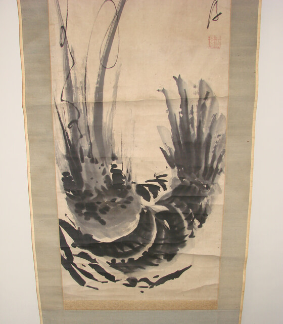 今回ご相談を頂戴したのはこちらの海老が描かれた掛軸です。水墨で力強く描かれ、画面下部から上部へとのびやかに伸びる海老の髭が非常に印象的な作品です。