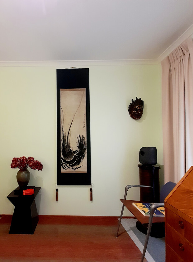 お客様は到着した掛軸をさっそくご自宅に飾ってくださいました。和室の床の間ではなく洋室の白壁に飾られていますが、周囲のインテリアとの調和も素晴らしく、とても洗練された空間となっております。