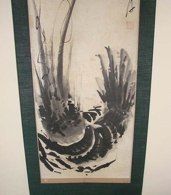 掛軸は主人が来客に対して季節や行事などに応じて最も相応しいものを飾り、おもてなしをする為の道具です。ゲストは飾られている掛軸を見て主人のおもてなしの気持ちを察して心を動かす。決して直接的な言葉や趣向ではなく、日本人らしく静かにさりげなく相手に対しておもてなしのメッセージをおくり、心をかよわせる日本の伝統文化です。