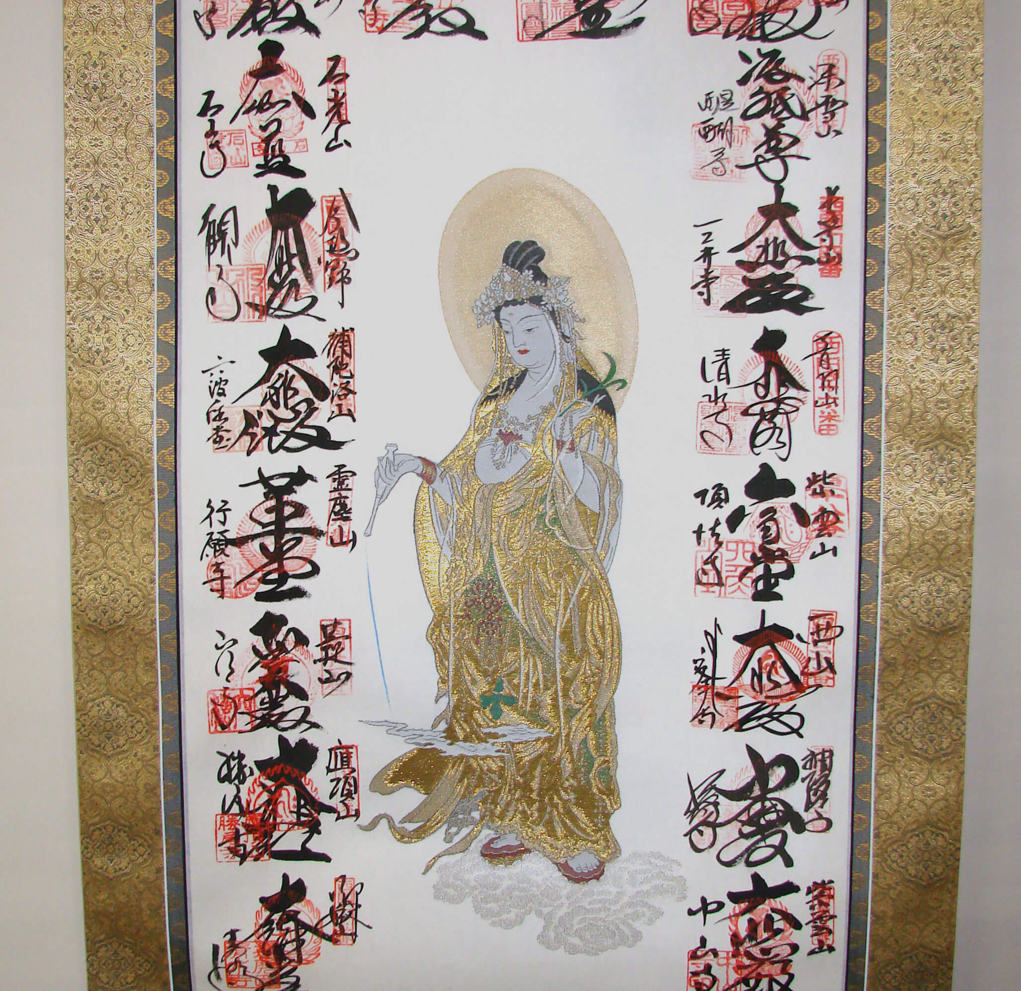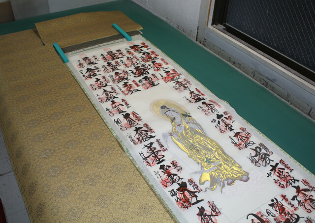 完成後は金糸刺繍の観音が主役として浮き立ち、その品格を引き立てる金襴が全体を包み込み、巡礼の重みを自然に支える一幅になりました。