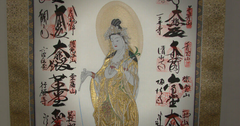 フランスのお客様の西国三十三観音霊場納経軸を掛軸に表装|金糸刺繍に合う金襴裂地の選び方