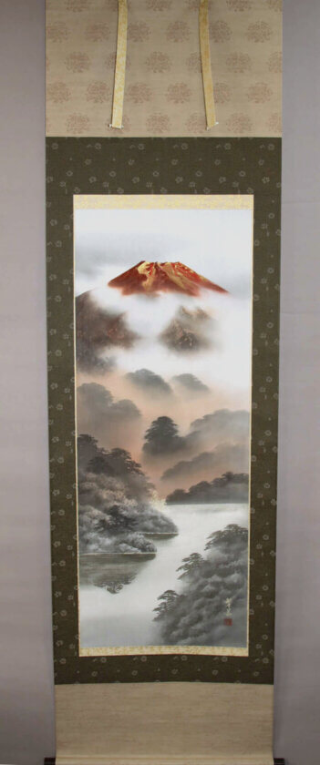 お客様は飾られる時期について気にされておられましたので、赤富士は日本ではよく縁起掛として正月やおめでたい席に飾られることが多い掛軸ですが、季節的には晩夏から初秋にかけてなので、秋掛として飾られても問題ない旨をお客様に丁寧に補足させていただきました。