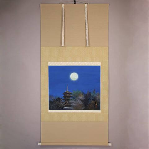 季節掛の一本というより、満月と寺院の景色が祝祭の雰囲気に見えるため、祝日や特別な日に掛けたいという希望でした。