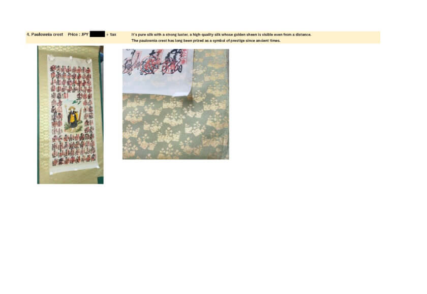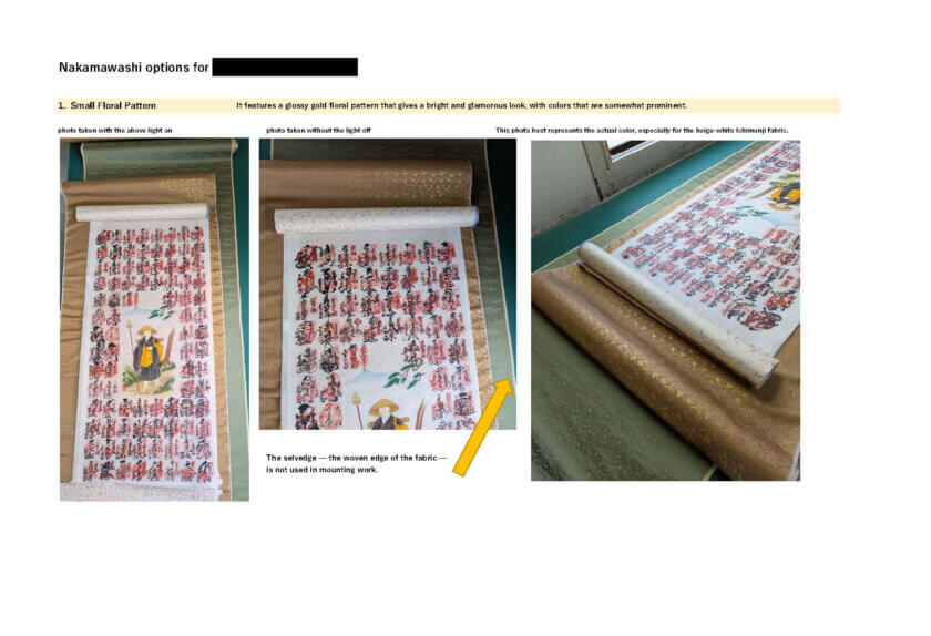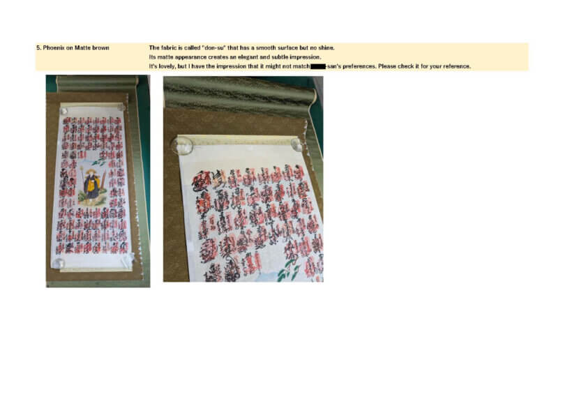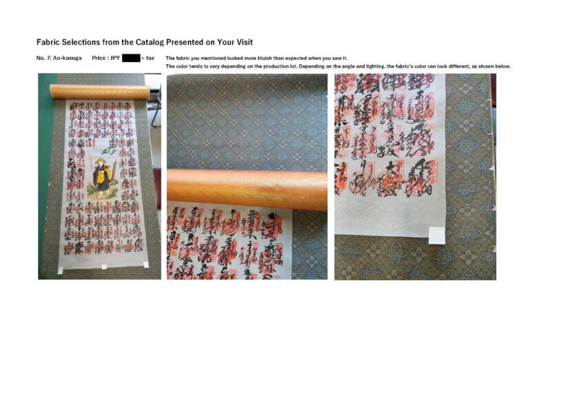 表装の仕様も決定し、表装作業の準備を進めている中、ご帰国後のお客様から、来店時に撮った裂地の写真を何度も見返しているうちに、もう一度考え直したくなったという率直なお気持ちが書かれたメールが届きました。