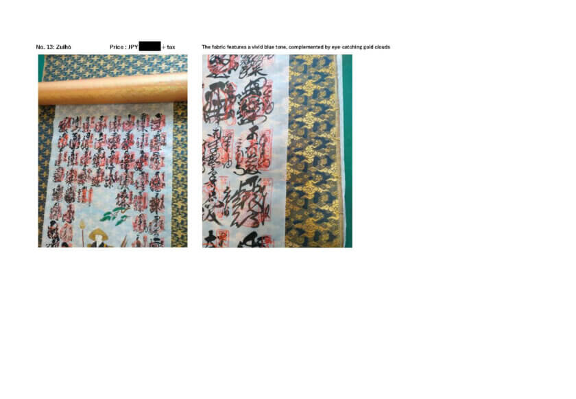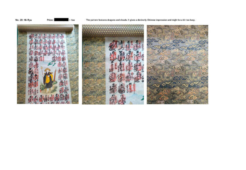 I came to Art Nomura in June. I wanted my Shikoku pilgrimage scroll mounted into a kakejiku. Tomoko-san helped me out, walking me through all the options (many options for very different budgets are available). My scroll stayed in Art Nomura to be mounted and shipped.