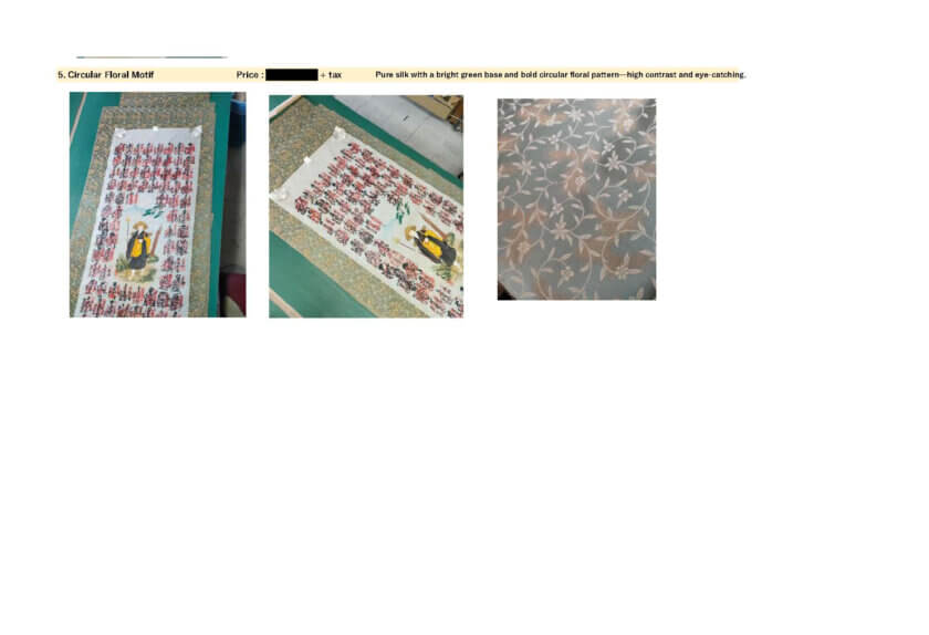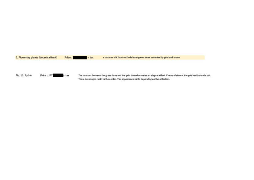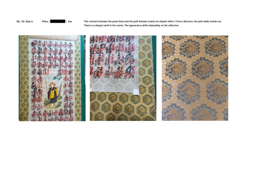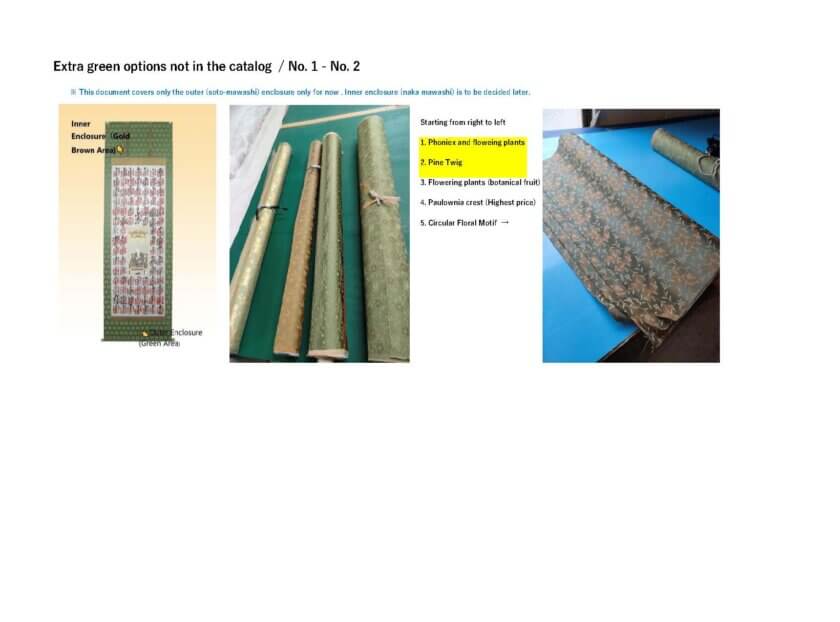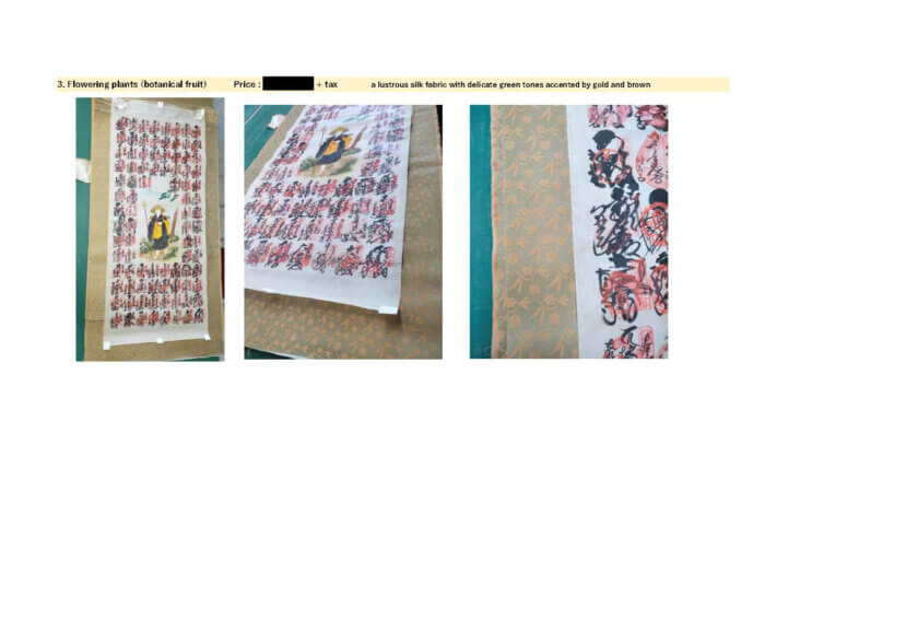 お客様が特に気にされていたのは緑系の裂地でしたので追加の緑系候補も含めた資料を整理してお客様にお送りさせていただきました。