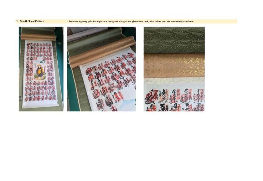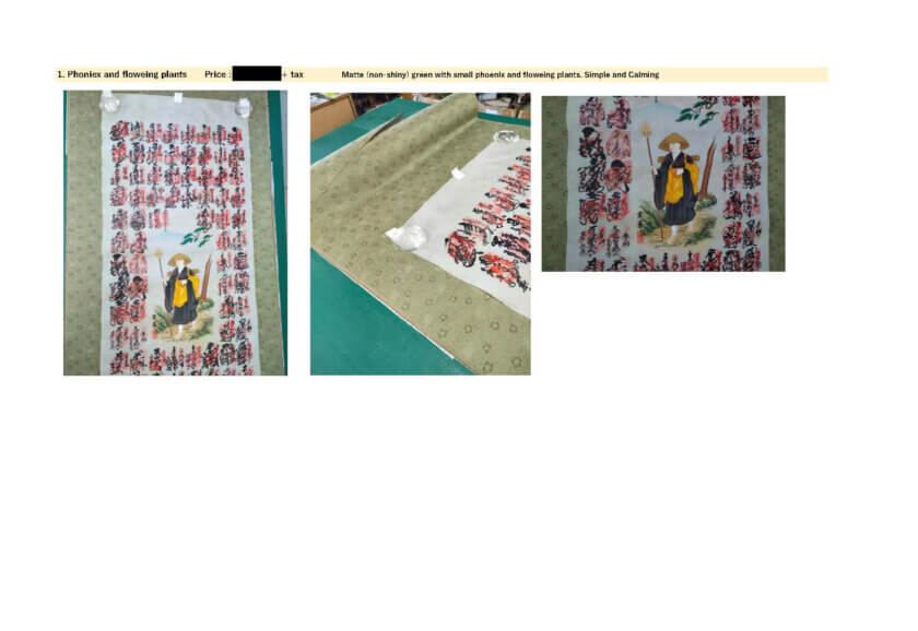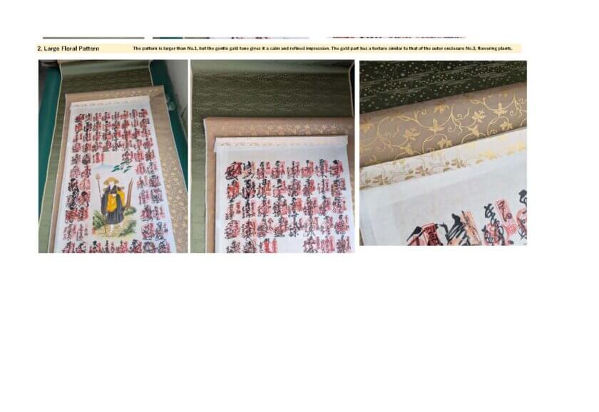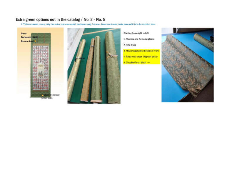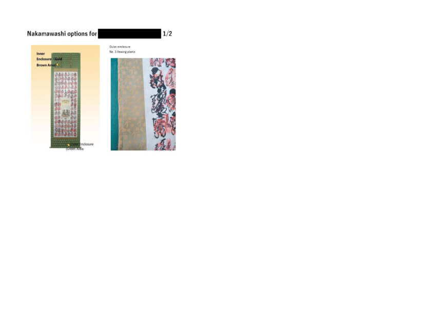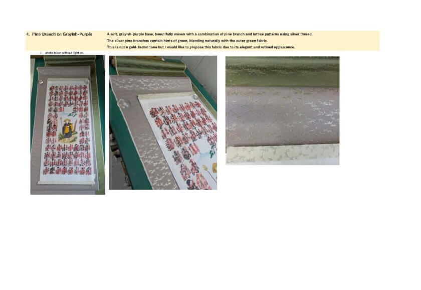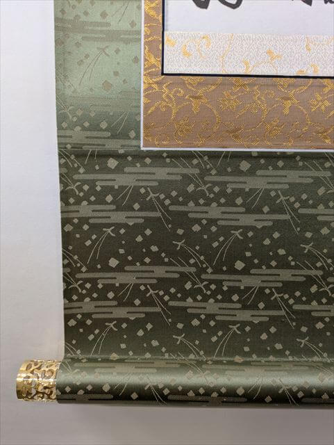 お客様は来店後のやり取りの中でも、緑色系統の裂地に強い関心を示されていましたので、今回はこちらの裂地の組み合わせで表装する事となりました。