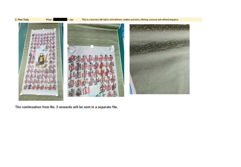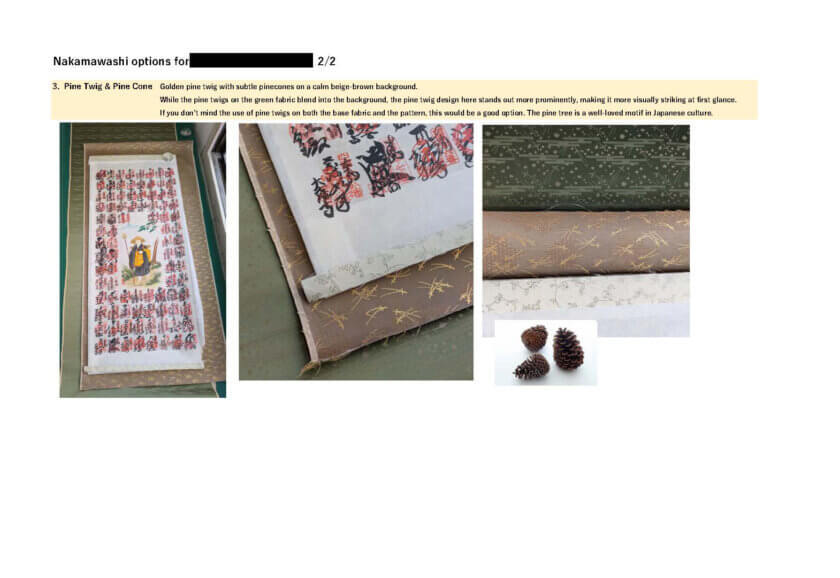 追加資料をご覧になったあと、お客様は「松の小枝」柄の緑系の裂地に強く惹かれていることを伝えてくださいました。