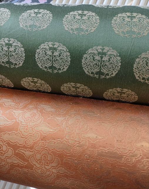 次にこの緑の内側に使う裂地の選定に話は移り、こちらもお客様のご希望をベースに様々な裂地をご提案させていただきました。