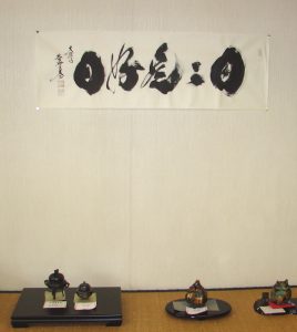 掛軸は主人が来客に対して季節や行事などに応じて最も相応しいものを飾り、おもてなしをする為の道具です。ゲストは飾られている掛軸を見て主人のおもてなしの気持ちを察して心を動かす。決して直接的な言葉や趣向ではなく、日本人らしく静かにさりげなく相手に対しておもてなしのメッセージをおくり、心をかよわせる日本の伝統文化です。