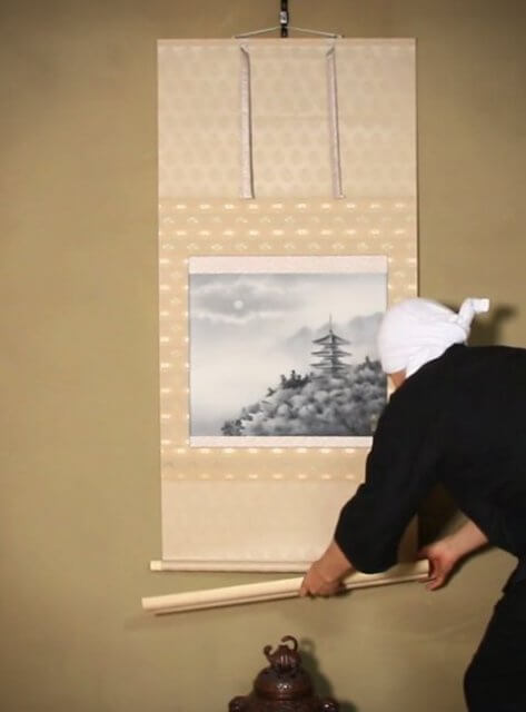 掛軸は主人が来客に対して季節や行事などに応じて最も相応しいものを飾り、おもてなしをする為の道具です。ゲストは飾られている掛軸を見て主人のおもてなしの気持ちを察して心を動かす。決して直接的な言葉や趣向ではなく、日本人らしく静かにさりげなく相手に対しておもてなしのメッセージをおくり、心をかよわせる日本の伝統文化です。