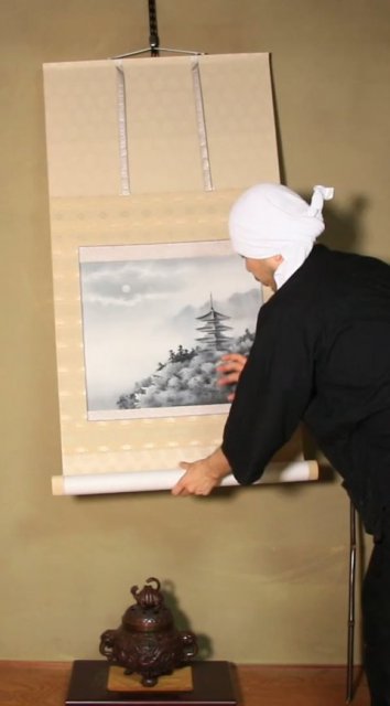 掛軸は主人が来客に対して季節や行事などに応じて最も相応しいものを飾り、おもてなしをする為の道具です。ゲストは飾られている掛軸を見て主人のおもてなしの気持ちを察して心を動かす。決して直接的な言葉や趣向ではなく、日本人らしく静かにさりげなく相手に対しておもてなしのメッセージをおくり、心をかよわせる日本の伝統文化です。