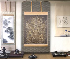 掛軸は主人が来客に対して季節や行事などに応じて最も相応しいものを飾り、おもてなしをする為の道具です。ゲストは飾られている掛軸を見て主人のおもてなしの気持ちを察して心を動かす。決して直接的な言葉や趣向ではなく、日本人らしく静かにさりげなく相手に対しておもてなしのメッセージをおくり、心をかよわせる日本の伝統文化です。