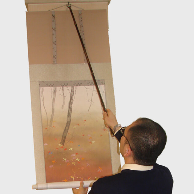 掛軸は主人が来客に対して季節や行事などに応じて最も相応しいものを飾り、おもてなしをする為の道具です。ゲストは飾られている掛軸を見て主人のおもてなしの気持ちを察して心を動かす。決して直接的な言葉や趣向ではなく、日本人らしく静かにさりげなく相手に対しておもてなしのメッセージをおくり、心をかよわせる日本の伝統文化です。
